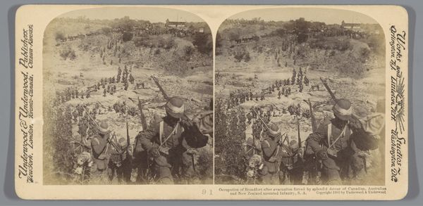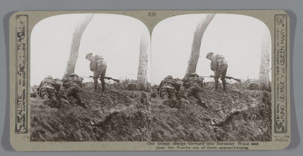 Curator: This gelatin-silver print, bearing the title "Zero hour! Prompt to the second, our men go over the top in a grand assault on Wytschaete Wood," captures a chilling moment from the First World War period. The stereo card format, designed for viewing in three dimensions, offers a deeply unsettling look at warfare. Editor: Immediately, the dense atmosphere of the photograph strikes me. The smoke, the confined trenches – it evokes a powerful sense of claustrophobia and impending doom. You can almost feel the tension and fear radiating from the figures. Curator: Exactly. This "Realistic Travels" view speaks to a society grappling with how to visualise and understand the war, employing realism to present it to a wider audience back home. Stereoscopic images like this one presented a version of 'being there' – sanitized perhaps, but impactful nonetheless. Editor: The symbolism is overwhelming. Soldiers poised to climb into what? Certain death, likely. Even the ladder acts as a symbol – a precarious, almost theatrical entrance into the unknown. I imagine the cultural resonance was profound, and heavily reliant upon the romanticised symbolism of war narratives at the time. Curator: I think we have to remember the powerful propaganda machine in Britain at the time that sought to idealise and promote participation in the war effort, and it's influence. Images such as this both reveal and conceal much about that brutal history, feeding both anxieties and a romanticised image. Editor: Absolutely. These images walked a tightrope. On one hand they depicted conflict, on the other, they often omitted the truly grotesque realities, maintaining morale and societal support, ensuring the war machine had an endless supply of manpower and support. Curator: The political forces that shaped images and visual depictions in World War One meant an incredibly skewed perspective when we compare it to contemporary reporting from areas of war today. We can question how this presentation might have shaped the perception of a global audience at the time. Editor: I find it thought-provoking that even through what could be seen as a sanitised lens, symbols of dread and violence can still speak clearly of tragedy today, transcending generations. Curator: Agreed. I come away understanding a little better the socio-political function such images played, both celebrating but also distorting reality for the population at home, while I feel you are drawn to read it’s underlying tragic motifs that endure so powerfully, irrespective of time.