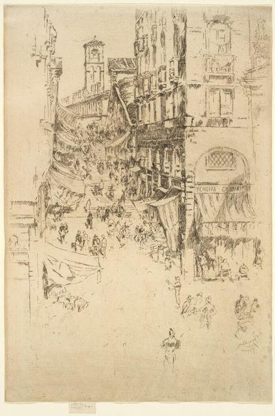 Joseph Pennell's "Market Place," now at the Minneapolis Institute of Art, captures a bustling scene through the delicate yet assertive medium of etching. The composition is immediately striking. Pennell employs a dense network of lines to construct the architecture and crowd, creating a dynamic interplay between light and shadow. Notice how the buildings loom, their facades etched with intricate detail that directs our gaze upward, while the market below is teeming with figures, their forms suggested with an economy of line that conveys movement and energy. Pennell's technique invites us to consider the urban space not just as a physical location, but as a semiotic environment. The architectural elements, with their imposing scale, speak to the power structures inherent in the city, while the market represents a space of exchange and social interaction. The overall effect is one of a fragmented, layered reality, inviting ongoing interpretations. Pennell uses line and form to give us a sense of not just what a market looks like, but how it feels.