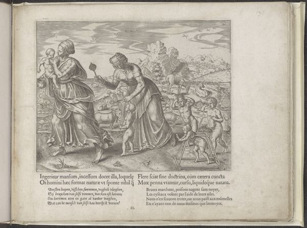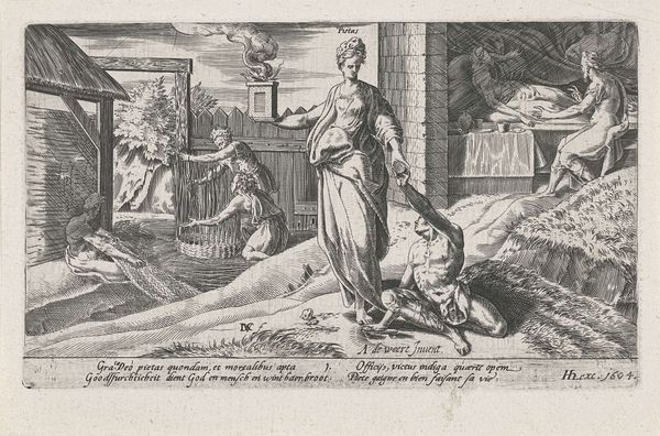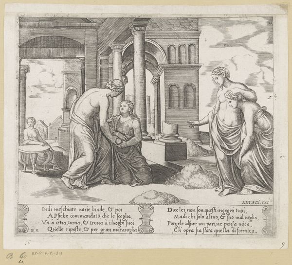 Curator: We're looking at "Psyche Opens the Jar of Proserpina's Beauty," an engraving dating back to approximately 1530-1560, attributed to the Master of the Die. It’s part of the Rijksmuseum's collection. Editor: It's striking how delicate the lines are for an engraving. The texture feels almost like a pen sketch, a fragile quality, considering the subject matter—the opening of a jar that promises trouble. Curator: Absolutely. This print captures a key moment from the story of Cupid and Psyche, specifically Psyche's descent to the underworld. We see her accepting the jar from Cupid to gather Proserpina's beauty for Venus, but of course, she’s tempted to open it herself. Editor: The process of engraving itself—the labor involved in meticulously carving these scenes into a plate—resonates with Psyche's own laborious tasks. The repetitive action mirrors the persistence needed for the completion of these endeavors. It would have taken dedication and a level of artistry to create a plate so full of such subtle changes. Curator: Indeed. The Italian Renaissance was fascinated by classical myths. This image served as an accessible means of circulating and visualizing such stories, embedding classical morality and narrative within Renaissance culture. It served as a visual representation of moral choices, a tale that carried consequences of human weakness in a broader cultural discourse. Editor: Consider how readily this engraving would be consumed. Its form allowed mass reproduction and wide circulation, bringing allegorical lessons such as this to an audience well beyond a noble class, where grander art projects, such as painting or sculpture, might have been more visible. Curator: That distribution shaped the public perception and understanding of classical myths. Editor: Seeing it now, I’m even more impressed by the subtle interplay of classical knowledge and material culture that made such accessibility possible. Curator: It's quite telling how much historical depth lies within this relatively small print.