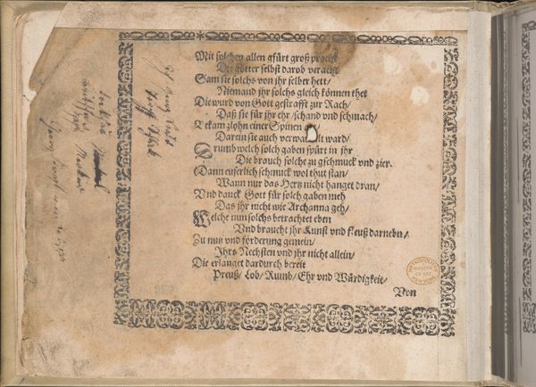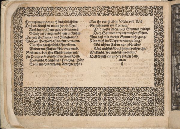 Curator: So, we're looking at a page from Johann Sibmacher's "Schön Neues Modelbuch," printed in 1597. It's a woodcut on paper, housed at the Metropolitan Museum. Editor: It looks like a page of ornate text, almost like a poem, surrounded by a decorative border. It feels…formal, almost impenetrable to a modern viewer. How do you interpret this work? Curator: The Modelbuch isn’t "high art" in the traditional sense. It's deeply tied to the economic and social realities of its time. These weren’t meant to be hung on a wall. They were pattern books, resources for artisans, particularly women, involved in textile production. Consider the materials themselves – woodcut, paper, ink, the very labor invested in each print, and who had access to such material. The means of production here, not some ethereal "artistic genius," are central. Editor: So, it's less about individual expression and more about the broader system of craft and production? Curator: Precisely! Look at the verses themselves, “Women/ who are rich in this art / With needles/works/ stitches fine / so artistic and practiced to be." It points directly to women's labour as skilled workers. Think about the cost and labour involved. Each print democratizes this style of art, challenges our modern hierarchy between "fine art" and "craft". How do we understand the function of pattern books such as this at the intersection of textual transmission and image dissemination? Editor: I never considered how accessible printmaking made these styles, and what that means to "traditional art." Thank you, seeing it as part of textile production, rather than just a piece of "art," makes a lot more sense now! Curator: Yes, seeing the piece in this new materialist and socio-economic context really highlights the ingenuity behind Sibmacher's piece.