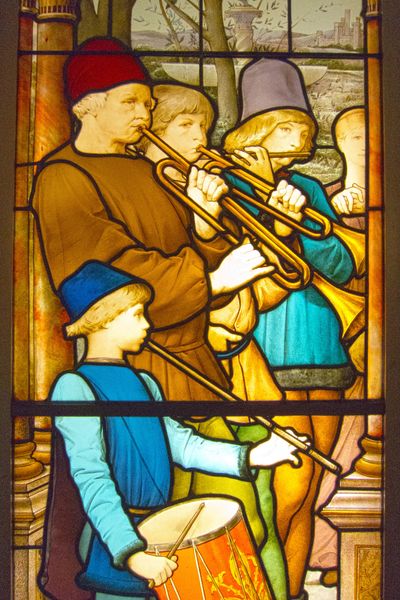 Curator: Immediately, I’m struck by the contemplative mood, the deep blues, reds, and yellows. It has a somber feel but is radiant. The composition leads the eye down and around. What a stunning piece. Editor: Indeed. The stained-glass panel, “The Virgin Annunciate,” attributed to Giovanni di Domenico and created sometime between 1498 and 1503, truly embodies the delicate balance of solemnity and grace that's characteristic of the Renaissance period. These windows offer not only artistry but religious storytelling and served as instruments for conveying religious narratives. Curator: The way the artist has depicted the Virgin’s downward gaze, it signifies humility, yet her halo suggests otherwise. Also, a question about what appears above her. Editor: Ah yes, that’s likely representative of the Holy Spirit. Visually, that light evokes divine illumination. The Annunciation is never simply about a message, it's about a transformational moment, a divine encounter, all caught up in powerful symbolism. The gold patterns evoke sacred spaces, reminding me of Byzantine mosaics. Curator: These artistic choices position Mary within a larger socio-cultural context, really influencing her portrayal within Florentine society. Her representation became the cultural understanding of femininity. Churches are more than just spaces of religious devotion; they're pivotal public arenas where these cultural ideals are reinforced and reimagined. How do we know that glass paintings would not portray ideals more clearly? Editor: True, stained glass also provides symbolic weight in cathedrals. However, if one studies religious symbolism during the Renaissance, a consistent set of beliefs is presented, and one recurring element that one observes in every iteration is that light is equivalent to illumination. And here, light is depicted through art. Curator: Certainly. This highlights how this medium carries so much symbolic power and reveals the artist's unique interpretation. Thanks for elucidating how it would resonate across time. Editor: It’s my pleasure. Studying this window today really demonstrates a lot about Giovanni di Domenico's contribution to Florentine sacred life.