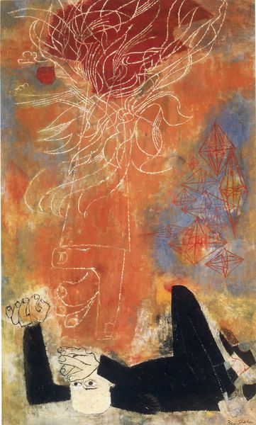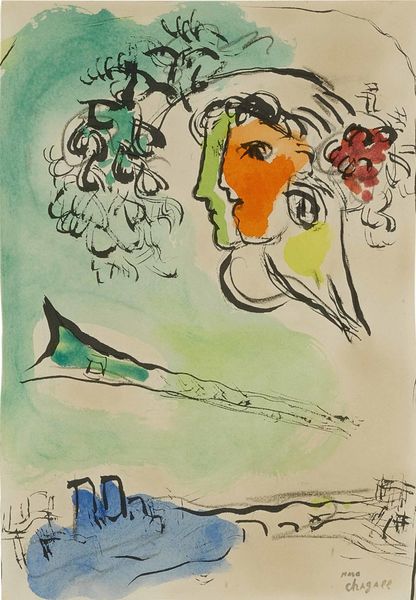 This dream-like image is a print by Marc Chagall, an artist whose long life spanned some of the most turbulent years of the twentieth century. Chagall was born into a Jewish family in Belarus, then part of the Russian Empire, and he spent his life negotiating his identity as a Jew in the diaspora, his sense of belonging always divided between his birthplace and the adopted cities where he made his art. Chagall's negotiation of identity is clear in his choice of imagery. Here, we see the Eiffel Tower looming behind a reclining, sensual woman. Floating alongside them is a goat, an animal often found in his work and a reference to his roots in Jewish culture. The composition has an emotional intensity which draws on Chagall’s experience of love and displacement. "If I create from the heart," Chagall once said, "nearly everything works; if from the head, almost nothing." This painting seems to reflect his ability to work from the heart, uniting personal and cultural symbols with a palpable dreamlike logic.