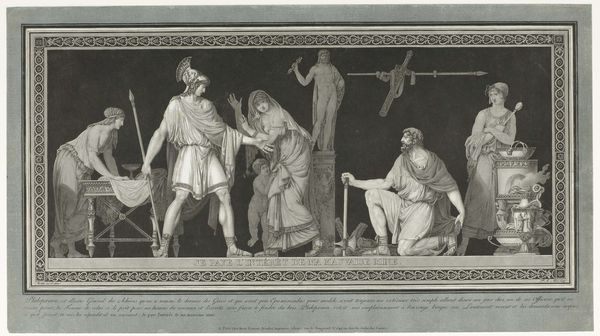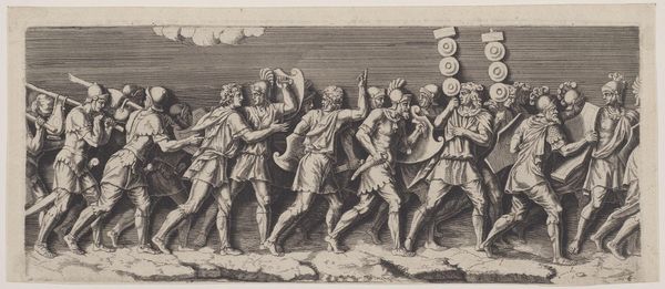 Curator: This relief, tentatively titled "Scene from the Eighty Years' War," was crafted between 1879 and 1890 by Willem Frederik Vinkenbos, apparently in wood. Editor: The relief is incredibly detailed, and it looks almost like it was carved from a single piece of material. It presents a very formal scene with multiple figures engaged in what looks like a negotiation. How do you interpret this work through the lens of its materiality and production? Curator: Well, considering its potential creation during the late 19th century, it becomes interesting to look at this work as not just art, but labor. The labor that was put into creating this by Willem Frederik Vinkenbos. We see not just the narrative elements but also the process. It speaks volumes about craft traditions coexisting with emerging industrial processes. Think of the contrast – meticulously hand-carved wood against mass-produced materials gaining popularity at the time. Don't you find that juxtaposition provocative? Editor: Absolutely. The act of carving such intricate details from wood, as opposed to say, casting a similar scene in bronze using industrial techniques, imbues it with a different kind of cultural meaning and, perhaps, suggests the patrons valued craft over the quicker mass productions options. Curator: Precisely! And what implications do you think the subject matter, a scene from the Eighty Years' War, has on this emphasis of handcrafted art? Editor: It might be referencing a glorious, but tumultuous past that should be preserved. Wood carving gives the piece a sense of history, referencing older practices but talking about relatively "contemporary" moments for the patrons and artist. The choice of a slower, more laborious technique underscores a dedication to preserving historical memory in a society rapidly modernizing. Curator: An astute observation! Considering that this piece's materials reference craft production techniques, which existed within this transitional period of making objects, this juxtaposition seems almost an explicit desire by the patrons for this work to act as a memorial and social document, rather than as a purely artistic expression of courtly grandeur. Editor: It reframes history-painting. It's less about glorifying war than solidifying cultural identity in changing times. This conversation makes me see the piece more critically and its role at this pivotal historical moment! Curator: Indeed. And seeing through the lens of its materials broadens how we perceive its impact then and now.