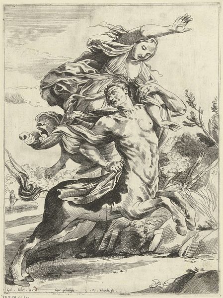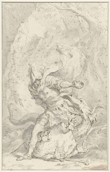 Louis de Deyster created this etching of a young man fleeing a sea monster sometime in the late 17th or early 18th century. This small Dutch print embodies a Northern European fascination with classical mythology. We see a nude figure from the back, scrambling up a rocky shore, away from a scaly, dragon-like creature emerging from the sea. The dramatic scene invites us to consider the social function of classical imagery in this period. The artist would have been trained in these visual codes in the drawing academies, themselves newly powerful institutions for the production and reproduction of art. Studying the classical past was considered essential to creating art with a public role and civic function. Art historians consult sources such as artist biographies, letters, and institutional records to understand the meaning and impact of works like this in their own time. The interpretation of art relies on its social and institutional context.