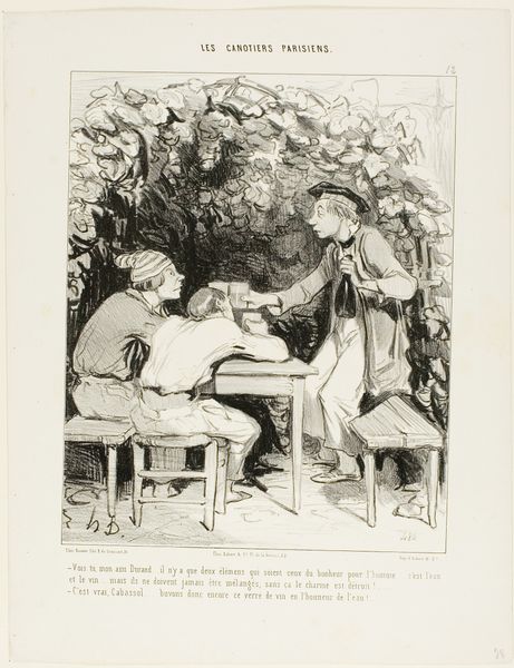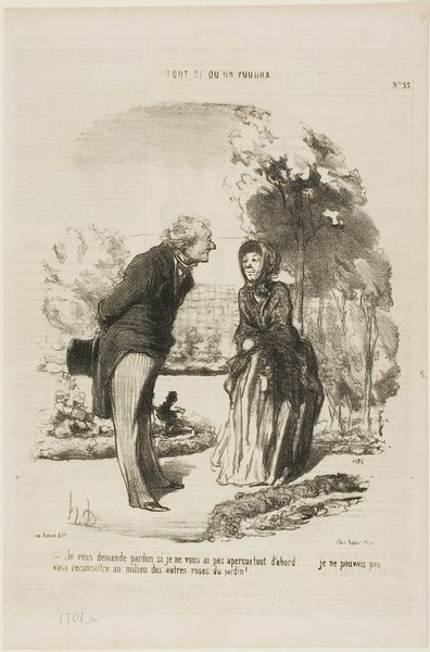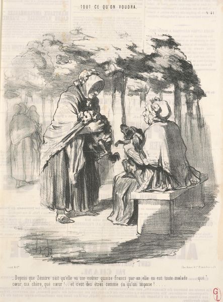 Curator: Here we have a lithograph by Honoré Daumier, titled "'Is this your dog here?', plate 20 from Tout Ce Qu'on Voudra," created in April 1847. It depicts a rather unsettling scene in what appears to be a public park. Editor: Unsettling is the right word! The stark contrast between the almost comical presentation of the… dog and the woman’s genuine horror is immediately striking. I find the piece deeply unsettling. It provokes a gut reaction. Curator: Daumier was a master of social commentary, often using caricature to critique the bourgeoisie of 19th-century France. This particular piece, part of a larger series, speaks to the anxieties and social absurdities prevalent during that time. Editor: Exactly, and it does so through the lens of gender and class. The woman's exaggerated reaction underscores the societal expectations placed upon women of a certain class—fragility, refinement—contrasted against what, is assumed to be, the working-class man presenting what may be a stolen or simply lost, and certainly deceased, animal. The question isn't merely about property, is it? Curator: No, I think you're spot-on. The image is loaded with potential narratives about power, ownership, and the often-humorous miscommunications between different strata of society. The setting, a public park, is itself a stage for these interactions. We often expect leisure in these public spaces, but the piece throws expectations off by showing us a harsh, arguably tragic reality that one segment of the population is blind to, yet another must face. Editor: And look at the way Daumier renders the dog—almost grotesque, dangling limply. It amplifies the emotional discomfort. The composition—with the implied line between the man and woman, with the park space acting as backdrop—keeps us focused on the relational dynamics and class commentary rather than getting mired in grief over a poor pup. It really captures that feeling of disconnect that defined so much of 19th century urban life. Curator: Indeed, a powerful snapshot of a society grappling with its own internal contradictions. It’s amazing how a simple drawing on paper can be so incisive and thought-provoking, don't you think? Editor: Absolutely, and it highlights the ongoing relevance of considering intersectional historical narratives for understanding the art and times, both past and present. It's a strong call to dialogue.