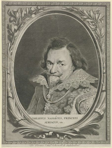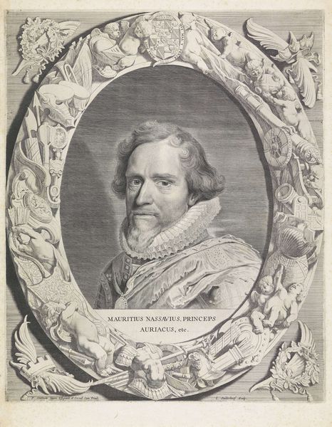 Editor: This is Pieter van Sompel's 1643 engraving, "Portrait of Philip William, Prince of Orange," housed here at the Rijksmuseum. It feels almost overloaded with ornamentation; dense, but incredibly precise. How should we even begin to unpack this image? Curator: Overloaded, yes, but gloriously so! Look at how the frame teems with life – cherubs, laurel wreaths, even hunted game. It’s a celebration, wouldn't you say? A theatrical staging of power and legacy. What grabs *you* first? Editor: I’m struck by the central figure's gaze. It's rather… calculating? Is that a product of the engraving technique itself, or is there more to it? Curator: Perhaps both! The engraving style, with its meticulous lines, certainly lends a certain intensity. But look closer – notice the slightly asymmetrical eyes, the set of his jaw. I sense shrewdness, weariness, maybe even a touch of melancholy. This isn't just a picture; it's a story etched in ink. A family story as well. I bet he knew hard decisions. What stories might it hint at, do you think? Editor: Possibly the complexities of his position, caught between the Dutch Republic and his Spanish ties? The duality seems mirrored in the frame – grandeur but also hints of vulnerability. Curator: Exactly! Art isn’t static; it's an ongoing conversation across centuries. Each line invites speculation. It also provides a lens into yourself, how YOU see and react to this man. The fun is the looking and speculating… the what-ifs and whys? What do you leave with now? Editor: That there’s a whole lot more to Philip William than just a stiff aristocratic portrait! Thank you, that was truly insightful.