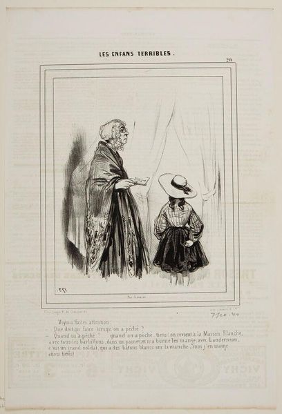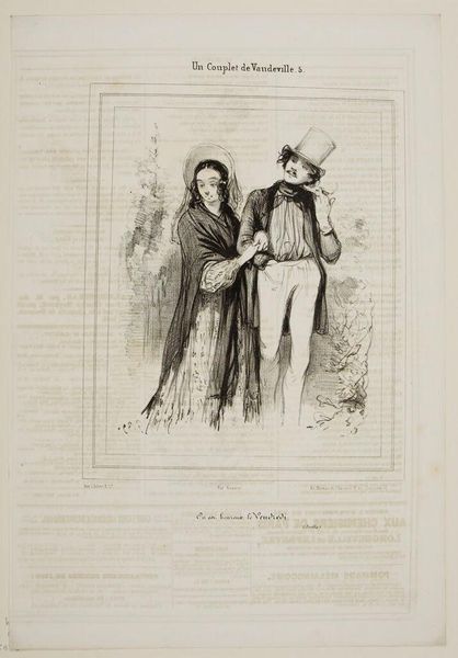 Curator: This print by Paul Gavarni is titled "On fait l'aimable le mardi," and it's currently held in the Harvard Art Museums. Editor: My immediate impression is one of understated elegance—the composition is a study in subtle gestures and textures despite its rather limited palette. Curator: The title hints at a ritualized social interaction, a specific day set aside for polite exchanges. The clothing itself speaks volumes about societal expectations and roles. Editor: Indeed, note the way the hatching defines form and volume, especially in the woman's patterned dress—it creates a visually active surface that contrasts with the smoother lines of the man's attire. Curator: Perhaps the contrasting styles reflect the separate spheres occupied by men and women in that era, a visual echo of their distinct social experiences? Editor: Possibly, and the shallow depth of field throws the encounter into stark relief, heightening the sense of theatricality. I find the restricted tonal range quite powerful. Curator: The print leaves me pondering the performance of politeness and the submerged meanings behind everyday interactions. Editor: For me, the artwork lies in the balance achieved between line and texture, subtly conveying the complexity of human relationships.
