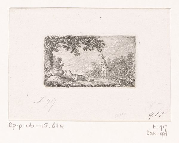 Editor: So, this is Daniel Chodowiecki's "Herderspaar toont affectie onder een boom met rechts drie schapen" from 1794. It’s an engraving, and it's quite small. I'm struck by how idyllic it seems, but also how… constructed? What catches your eye? Curator: The most compelling element is how the artist's choice of engraving as a medium informs the artwork's meaning. Chodowiecki, in using printmaking, participates in the democratization of images, making art accessible to a broader audience beyond the wealthy elite who could afford paintings. The labour intensive nature of engraving contrasts the romanticised leisure of the herders in the image, hinting at a deeper social commentary on labour, class, and consumption of idealized rural scenes. How does the reproductive nature of the print change our understanding of it? Editor: That's a really interesting point. I hadn't considered the implications of it being a print and accessible to the masses. So the medium itself is making a statement about society? Curator: Precisely. Engraving, unlike painting, allowed for multiple reproductions. Chodowiecki, a successful artist of his time, could make money from making engravings; they would be accessible for private ownership and would adorn household walls of middle-class citizens, fostering a sense of shared culture through replicated imagery. The fine lines and detail of the engraving also suggest a level of craftsmanship, a deliberate act of skilled labour for mass consumption. Do you see that commentary in the print now? Editor: Yes, absolutely. Seeing it just as a pastoral scene feels really superficial now that I understand its mode of production. It’s less about the romance and more about how the image circulates. Curator: Exactly! And considering the historical context of the late 18th century, with burgeoning capitalism and shifting class structures, the image becomes even more layered. Editor: This has totally changed how I see prints. I am grateful for this new way of considering material realities, thank you! Curator: A pleasure! Keep questioning the materials and you will unlock deeper meanings!