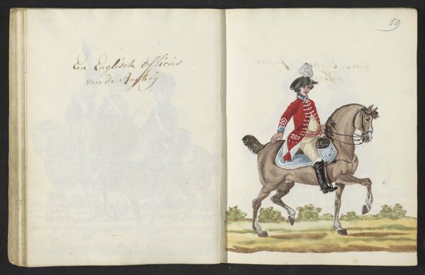 Curator: At first glance, the two horsemen seem frozen mid-stride, as though the artist, S.G. Casten, sought to immortalize these symbols of authority on the page. Editor: It feels melancholic. On the left-hand page, a spectral mirror image looms behind calligraphic text, while the men and steeds on the right carry themselves with severe rigidity. There is a profound absence lurking here. Curator: Yes, I sense it too. What you’re interpreting as absence I experience more as preservation. The uniforms denote a visual representation of power; observe how each minute embellishment might embody particular values tied to identity. Note how meticulously each stripe, plume, and button has been articulated in watercolor. Editor: Those uniforms are meant to inspire both respect and fear. Considering this drawing was executed in 1795–96, during a period of immense social upheaval across Europe, the precision seems less about timeless preservation, and more about an anxiety to rigidly codify a crumbling social order. The ghosting to the left? Perhaps revolution looming? Curator: Perhaps! I do find that, within its formal restraint, a more romantic sensibility comes through. Consider, for example, the symbolism that the horses provide – embodying both power and freedom within these very formal compositions. They appear restless even, which speaks volumes about the romantic era. Editor: Power and freedom… for whom, though? The hollowness in those phantom riders on the facing page suggests an emptiness beneath the shiny armor of romantic idealism. Who benefits and who is marginalized by the spectacle? This history painting, however delicately rendered, begs questions about the relationship between representation and systemic inequity. Curator: These guards – these gatekeepers – exist still as potent archetypes, and they evoke very old cultural memories of hierarchy, loyalty, and tradition. Regardless of who wears them and why. Editor: Yes, seeing this drawing has reminded me how vital it is to confront inherited histories of power, questioning those symbols we often accept without scrutiny. It gives us pause to think about how we understand legacy in contemporary times. Curator: Ultimately, this is why studying images—however subtle, spectral or overt—remains critically important, for in these images the iconography remains as a symbol over time.