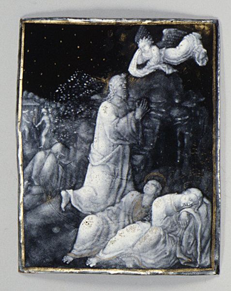 Editor: This is "The Crucifixion," one of seven enamel paintings by Jean II Pénicaud, created sometime between 1530 and 1565. It's currently at the Metropolitan Museum of Art. It has an intense, almost dreamlike quality to it with the stark contrast between the figures and that inky background. What are your initial thoughts on the composition and structure? Curator: The dominance of monochrome is striking. Observe how Pénicaud meticulously articulates form using grisaille enamel on a dark ground. It forces us to contemplate line and shape foremost, rather than get distracted by coloristic effects. The artist skillfully manipulates the material properties to sculpt the figures, with precise detailing around Christ’s body and the Virgin Mary’s draped form, can you see how the dramatic contrast directs your eye? Editor: Yes, it's definitely strategic! The stark whites against the black pull you right to the figure of Christ. The expressions of agony are clearly visible too. Is the almost severe style of working in monochrome typical for the period? Curator: Not necessarily. Remember, the function of this type of enameled artwork would often dictate the materials deployed by an artist. This grisaille technique accentuates the sense of gravity and emphasizes form over painterly effect. This, in turn, elevates its iconographic function as an object for contemplation and devotional practice. Editor: That's fascinating. It really highlights how much of the message comes from the formal elements rather than the narrative itself. Thank you for the insight! Curator: Indeed, examining the structural relationships helps reveal deeper artistic intentions, focusing less on cultural context and more on the enduring language of visual expression. A useful exercise to repeat across different artworks.