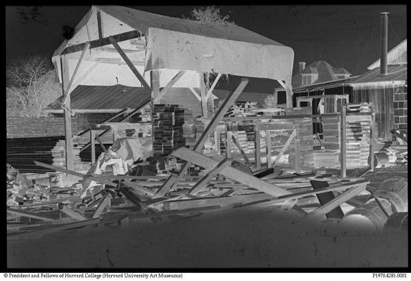 Curator: This haunting photograph, "Untitled (buildings damaged in storm)," is by Lucian and Mary Brown. Look at how they captured this scene of devastation. Editor: The composition immediately strikes me. The stark contrast between the destroyed structures and the vast darkness evokes a sense of desolation. Curator: Indeed. The image size, only about 4x5 inches, belies the scale of the disaster suggested. We might consider the materials, the photographic paper and chemicals, and what they represent in terms of documentation and social response to natural disasters. Editor: The chaotic arrangement of debris, the skewed angles, disrupt any traditional sense of order. The formal qualities mirror the breakdown of stability. Curator: It makes you wonder about the labor involved in rebuilding, the economics of disaster relief, and who has access to those resources. Editor: Perhaps it is about the fragility of human structures against natural forces? A visual study in the impermanence of things. Curator: Precisely. This image prompts essential questions about community resilience and the impact of environmental events on vulnerable populations. Editor: I agree. It's a powerful reminder that even in destruction, there's a strange, compelling beauty to be found through form and light.