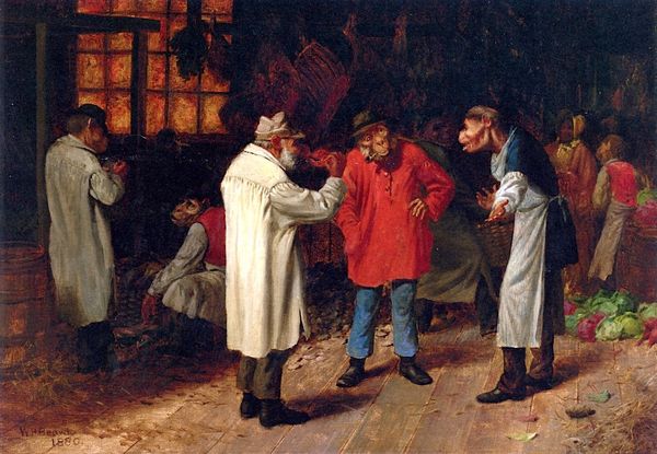 Vasily Perov painted "Caretaker Letting an Apartment to a Lady" with oil on canvas; we don’t know exactly when, but it captures a slice of 19th-century Russian life. In this small painting, we witness a fraught encounter between a caretaker and two women seeking lodging. The caretaker, barefoot and disheveled, embodies a certain gruffness of the working class, while the women, draped in somber attire, appear reserved and perhaps vulnerable. Perov, known for his social realism, doesn't shy away from depicting the stark realities of class disparity. The setting, likely a humble dwelling on the outskirts of town, speaks volumes about the limited options available to women in search of housing. The caretaker's aggressive posture and the women’s demure stance speak to the power dynamics at play. Perov seems to capture a moment ripe with tension, hinting at the struggles and indignities faced by marginalized women in Tsarist Russia. It makes you consider what it must have felt like to navigate a society where one's gender and economic status largely determined their fate.