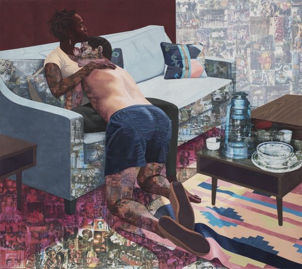 Art Historian: Editor: This is “Thread” by Njideka Akunyili Crosby, from 2012. She used mixed media – acrylic, collage, and solvent transfer – on paper. I'm really drawn to the layered textures and the intimate pose of the figure. What's your take on this work? Art Historian: What strikes me is the very process by which Crosby brings together disparate elements – printed photographs, paint, and patterned cloth. The solvent transfer is key here; consider it as an index of global exchange, bringing visual fragments from popular media. How does the interplay of these materials contribute to the piece's meaning, do you think? Editor: Well, the figure seems almost…assembled. The collage elements make me think about identity, maybe fragmented or multiple identities? And the patterned fabric really grounds it in a specific cultural context. Art Historian: Exactly. It prompts questions about consumption. This piece invites us to look closely at the 'how' of image-making. How does this process relate to contemporary Nigerian identity, especially within the global market? Think about how the fabrics and printed media operate within capitalist systems. Is she criticizing or celebrating appropriation? Editor: It seems both critical and celebratory, maybe? Like, she's acknowledging the influence of global culture while still rooting it in something personal and specific. So, it’s about showing a person embedded in globalized making practices. Art Historian: Yes! Considering that it’s called ‘Thread’, it implies a binding material that can stitch together personal histories. We're not just passively viewing a portrait. Instead, it shows how history, commerce and representation can actively weave personal narratives through material processes. I hadn't thought about Crosby’s weaving of history with material before our chat! Editor: I'm really looking at materials and contexts in art differently. Thanks so much.