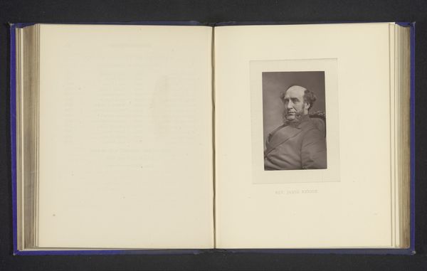 Curator: This intriguing image presents us with a portrait of Earl Cairns, dating to before 1881. It's ink printed on what appears to be aged, perhaps even homemade, paper. Editor: Immediately, I'm drawn to the paper itself! It looks almost velvety, like you could reach out and feel its history. The portrait gives off a serious vibe – very "Victorian gentleman." Curator: Indeed. The image provides a window into Victorian society and its reverence for figures like Cairns. His portrait, embedded within this particular paper, speaks to notions of permanence, legacy, and the construction of historical memory. We can think about the power structures that enabled and sustained his prominence. Editor: Totally. And, honestly, that font underneath the portrait – so ornate! It almost feels like they’re trying a bit too hard to scream “important!” But I do like how they chose to frame the image inside the right page. There is another full, empty, left side page of this beautiful book. Curator: Exactly! The placement elevates the subject, reinforcing the established hierarchies. However, consider also how the very choice of paper – potentially homemade, or deliberately aged – might be subtly challenging those same rigid structures. It introduces a handmade, somewhat vulnerable quality, a potential fissure in the veneer of unyielding power. It makes me consider who made the book! Editor: That’s interesting. I'm just struck by how much quieter and smaller and vulnerable it feels to me now! I almost feel like making a collage on that blank space on the left! The crisp emptiness is quite suggestive. Curator: I agree; the book’s format as a whole creates a juxtaposition of power and fragility. This tension mirrors larger societal conflicts inherent to the late 19th century: between tradition and modernity, stability and revolution, visibility and erasure. Editor: I didn't think a simple book opening could say so much! Looking closer really did open it all up! Curator: Yes! I think that through a work like this, we gain insights into Victorian values while acknowledging the era’s internal contradictions. Editor: Definitely more to it than just a stern face on paper, isn’t it?