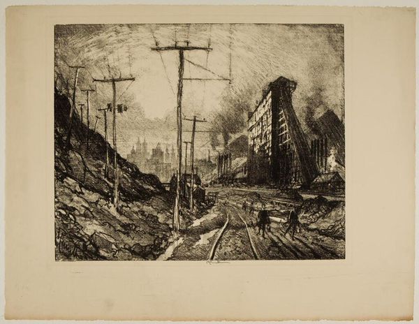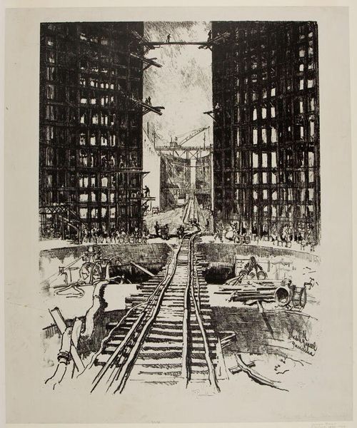 Editor: Here we have Joseph Pennell’s "The Elevated," a dramatic print of turn-of-the-century New York. It's so evocative. What do you make of the relationship between the architecture and the train? Curator: Pennell's print presents a city wrestling with modernity. The elevated train, a symbol of progress, cuts through the older urban fabric. Notice how the buildings loom, almost dwarfing the train itself. Is this a celebration or a critique? Editor: I see what you mean! It’s like the city is both embracing and being overwhelmed by this new technology. Thanks for helping me see that tension! Curator: My pleasure. It’s a great example of how artists engage with their rapidly changing environments.