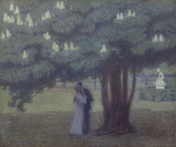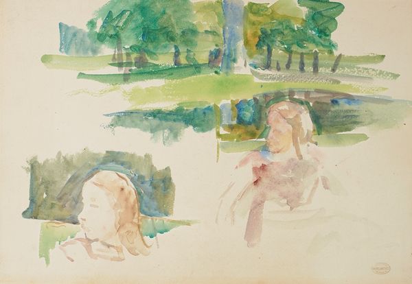 Editor: Here we have "Ophelia by the brook – Act IV, Scene VII, Hamlet" by Edwin Austin Abbey, likely a painting on paper from around the turn of the 20th century. The scene feels… delicate, fragile even. Almost like a half-remembered dream. What does this scene evoke for you? Curator: Ah, yes, Ophelia. This rendering of Shakespeare's tragic figure is a wisp of a memory. Edwin Austin Abbey captures a moment of utter vulnerability. I’m struck by how he uses watercolour to suggest transience. The colors seem to bleed and weep into each other just like our tears! Doesn't the composition strike you as somewhat unbalanced, perhaps echoing her unstable mental state? Editor: I see what you mean – she's not quite centered. I guess that contributes to the sense of unease, that something is… off. I find myself drawn to the color palette – soft pastels juxtaposed with that stark, looming tree. What does that contrast signify to you? Curator: Exactly! The soft pastels lend a certain pre-Raphaelite prettiness – a dangerous beauty, masking the grim reality of her situation. The tree... well, that's her impending doom, isn't it? Solid, unyielding against the ethereal quality of Ophelia herself. Almost a looming, judgement. You know, it makes me think of our own attempts to grasp at beauty even amidst terrible sadness. Doesn't it? Editor: That’s a very powerful thought. It does kind of highlight that constant tension between beauty and tragedy. Curator: The entire scene becomes a haunting poem, doesn’t it? Abbey masterfully makes us feel the poignant dance between reality and oblivion in poor Ophelia’s world…and ours. Editor: Absolutely, and now, I definitely see more of Ophelia's fragile mental state. Thanks for that reading!