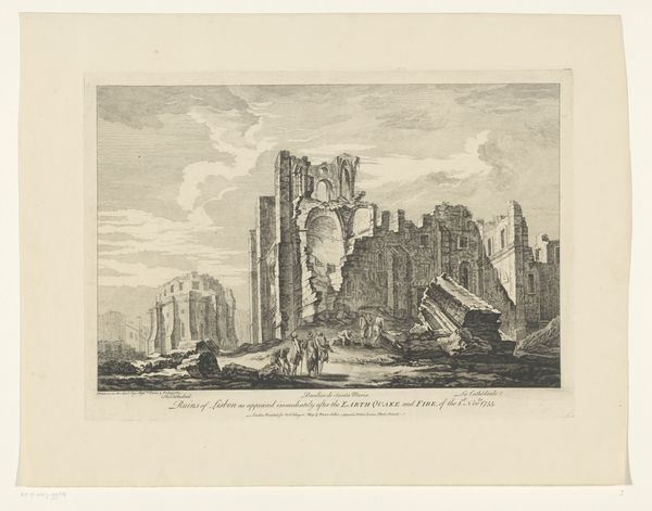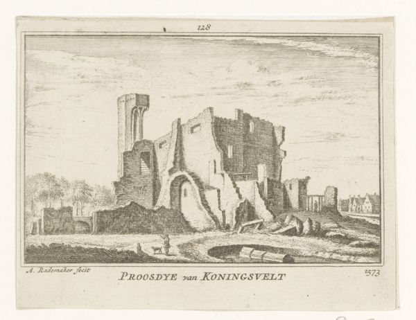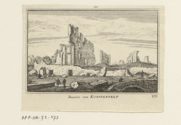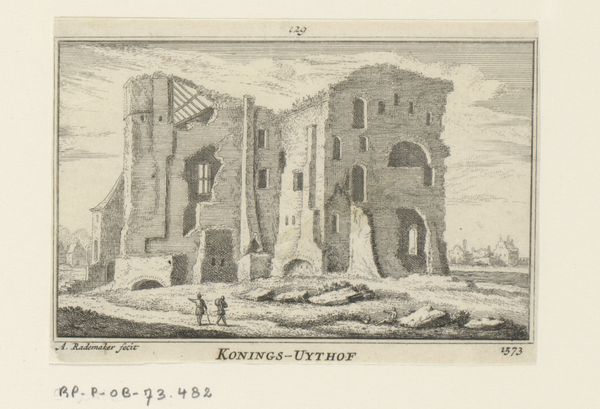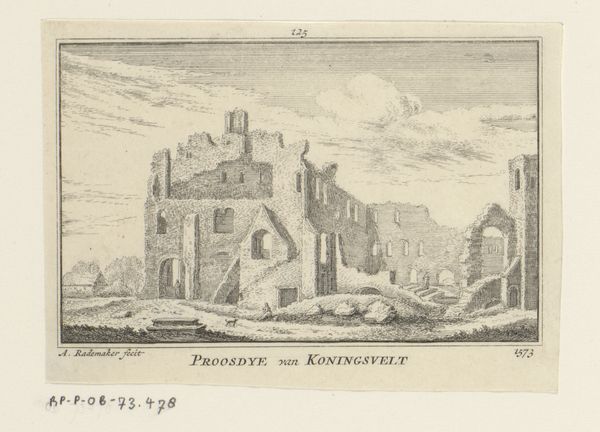 Editor: This engraving, "Gezicht op de ruïne van het klooster Koningsveld," by Abraham Rademaker, made sometime between 1727 and 1733, depicts the ruins of a monastery. I’m struck by the contrast between the detailed rendering of the decaying architecture and the mundane activities of the figures in the foreground. How do you interpret the choice to represent a ruin like this? Curator: This piece offers a potent statement on the cyclical nature of power and institutions. Consider the political context: the 16th century saw significant religious and political upheaval in the Netherlands. This monastery's ruin likely signifies more than just physical decay. It reflects a societal shift, a rejection of old orders. Who was benefiting from these images and why were these commissions being produced at that moment in time? Editor: So, showing the ruin becomes a kind of visual commentary? Like saying, “Look what happens to even the most powerful institutions?" Curator: Exactly. It served as a powerful, public facing reminder. Rademaker wasn't just documenting a landscape, he was participating in a dialogue about the transformation of Dutch society. How do you think the style – this Baroque approach – affects the message? Editor: Well, the detail lends it a certain gravitas, I guess. Makes it feel less like a simple record and more like a considered statement. The printmaking medium would have allowed for wide circulation, making the work all the more politically effective. Curator: Precisely. The choice of print is crucial to understanding its cultural impact. It was an accessible medium, allowing these ideas about societal transformation to circulate broadly, solidifying these ideologies as the dominant view. It's fascinating how a landscape can become such a politically charged image. Editor: I see now. It's not just a pretty picture; it's a historical document, shaped by the politics of its time. I hadn’t thought about how the printmaking method enabled distribution of imagery or the public perception, it’s made me rethink everything.