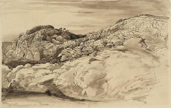 Editor: Thomas Girtin’s "Sunrise on the Sea" is rendered in watercolor, and it evokes such a somber mood. What do you see in this piece? Curator: I see the weight of empire. Girtin, painting at the height of British naval power, subtly critiques its cost. The crumbling architecture juxtaposed with the ship on the horizon suggests the fragility of even the most powerful institutions, reflecting the social inequalities perpetuated by colonialism and its impact on the landscape and its people. Editor: That’s a perspective I hadn’t considered. How does the ship itself play into this reading? Curator: It’s a symbol of both progress and oppression, isn't it? It connects cultures while also enabling exploitation, representing a complex interplay of power and its discontents. Editor: This gives me a lot to think about regarding art's role in reflecting and challenging societal structures. Curator: Indeed. It reminds us that even landscapes are not neutral; they are laden with history and ideology.