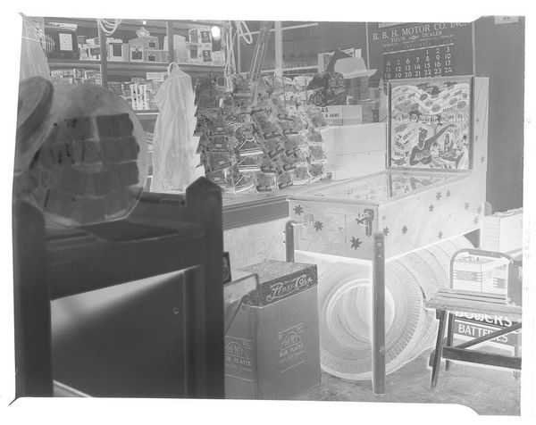 Curator: This photograph by Hamblin Studio offers us a peek inside Lee's Esso Grill. It's an unnamed work, a simple 8x10 cm glimpse into a time gone by. Editor: It's a study in density, isn't it? All those products crammed together. You can almost smell the stale cigarettes and sugary treats. I wonder about the supply chains, the hands that stocked those shelves. Curator: Absolutely. It speaks of a world where local businesses were the lifeblood of communities, where every item had a story, and the shelves were stocked to the brim. It’s a nostalgic tableau, bittersweet somehow. Editor: Bittersweet indeed. Those shelves are testaments to the labor, the constant restocking, the consumption that fueled this humble grill. What a wealth of material culture in a single frame. Curator: It makes you wonder, what was the daily life like for the people who frequented this place? What stories did these walls hold? Editor: And what did it all cost to produce, distribute, and ultimately consume? Now that's a story I'd love to uncover.