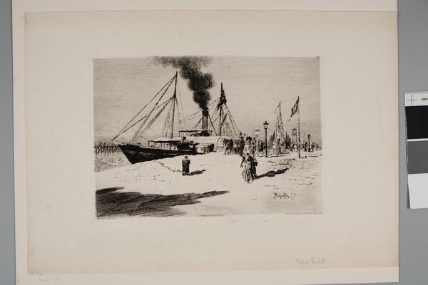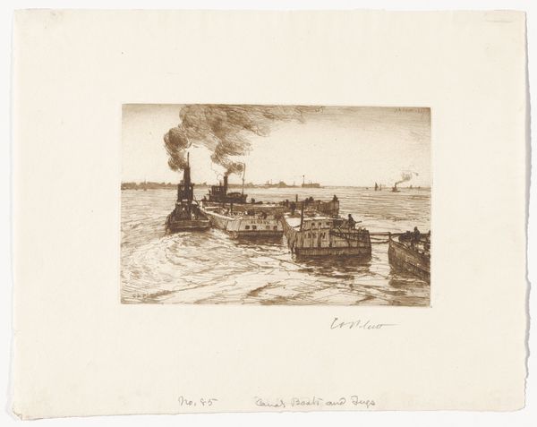 Curator: Looking at this print, "Canal Boats and Tugs" by Charles Adams Platt, it gives me a sense of industry, of things being moved and made. Editor: It's funny you say that. The first thing I notice is how subdued it is, even with the churning water and the smoke rising. It feels more like a memory than a moment. Curator: I find it amazing how much texture Platt gets out of what I assume is an etching. The way he renders the water, it’s almost palpable, isn't it? Editor: Absolutely, and that's likely because of the social reality of the tugboats themselves, right? He's showing us the backbone of an industrial economy, the sheer labor of logistics. Curator: I never thought of that. I was too busy feeling the grimy romance of it all. But you're right, it's about more than just aesthetics. Editor: Exactly! The lines of this etching tell a story of work and material exchange, a history etched into the metal plate. Curator: Well, I'll never look at a tugboat the same way again. Editor: Me neither. It is quite beautiful to consider it, as well, so I understand your initial reaction, too.