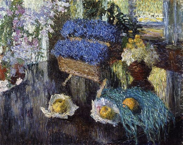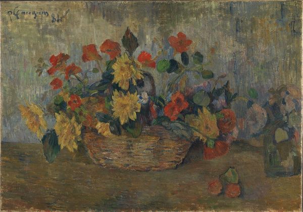 Curator: "Basket of Flowers," painted by Paul Gauguin in 1884. We find it here at the Philadelphia Museum of Art. Editor: It's visually dense, almost chaotic at first glance, isn't it? The basket itself feels overloaded with those pale pink blooms. I get a sense of transient beauty, moments away from fading. Curator: Right, notice how Gauguin used oil paints here to simulate weaving? The basket isn't just a container; it's rendered through active brushstrokes that mimic the craft. It’s interesting to think about what this conflation implies – is Gauguin collapsing a divide between supposedly ‘high’ and ‘low’ art forms? Editor: Symbolically, the flowers themselves might be important. The prevalence of pink tones could signal innocence, or even hidden vulnerability, offset against that darker background. Notice the dark blues – those might connote melancholic emotions that clash a little with those brighter colours in the main body of the flower arrangement. What flowers did the flowersellers and painters had in mind? Are they linked with traditional folk meanings for him, or perhaps for his market in the area? Curator: An intriguing connection! It leads us to wonder about consumption— who were the flower consumers during this era, and were flower paintings merely luxury items meant to echo these displays? Were paintings available when flowers were not? Editor: Absolutely. But more than simple visual documentation, it feels emotionally charged. Gauguin is working with memory, I think. The fleeting nature of those colors is working hard to evoke those strong feelings we associate with these things in our personal history. A melancholic nostalgia comes from that tension of tones too. Curator: Definitely, Gauguin utilizes texture here in ways which defy easy reading, suggesting both something manufactured, something for sale perhaps, yet evoking personal feeling – through a crafted form. Editor: I come away feeling slightly bittersweet, caught between fleeting loveliness and looming decay. Curator: It shows that the mundane item is deeply impacted by consumerism, technique, social standing, as it is indeed tied to broader economic issues of the time, something too often missing from how we understand art history.
