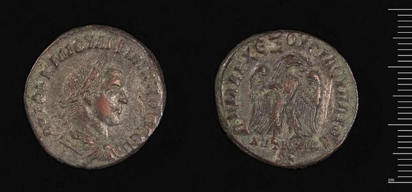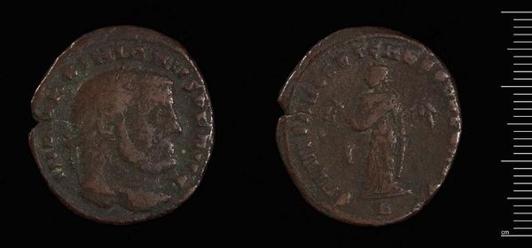 Editor: Here we have a Follis of Galerius from Aquileia. It's small, clearly very old, and the details are worn but still legible. What do you see in this piece, Curator? Curator: Well, first off, it's not just a coin, it's a tiny window into an empire! Look closely – that’s Galerius himself, staring out across the centuries. The other side? Feels like a symbolic promise of prosperity, doesn't it? Coins like this were how emperors communicated with everyone, every single transaction a miniature propaganda campaign! Isn't that wild? Editor: It is wild! I never thought of it that way before, just as currency. Thanks for making me see it in a new light. Curator: My pleasure. History isn't just in books; it's in our pockets, sometimes literally!