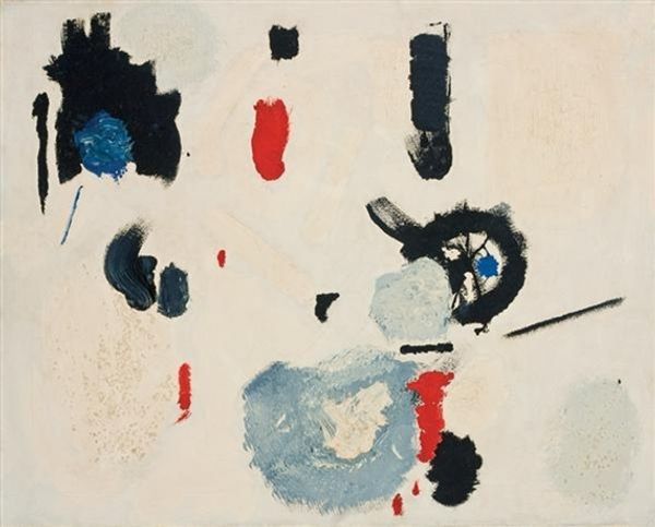 Paul du Toit made this untitled painting with paint that's laid on pretty thick, giving it a real presence. It’s all about the shapes, amorphic and blocky – they push and pull against each other, creating a lively visual dialogue. See how the stark black outlines define these forms, almost like they’re characters in a play. Then there’s that vibrant palette, colours jostling for attention, from the bright yellows and greens to the bold reds and blues. Take a look at the pair of eye-like forms, each rendered with concentric rings, almost like targets drawing you in. Do you notice how the heavy black outlines against the bright colour fields give them a kind of playful intensity, an almost cartoonish vibe? I’m reminded of work by artists like Jean Dubuffet, who also embraced a raw, expressive style. It's a reminder that art is always a conversation, building on what came before and pushing towards something new.