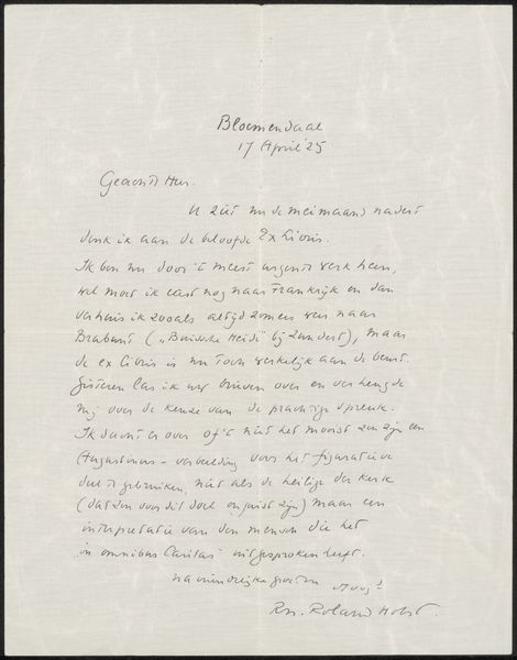This letter was written by Richard Nicolaüs Roland Holst to Pieter Haverkorn van Rijsewijk, probably in 1916. Look at the way the ink just seems to float across the page, each word a little island of thought. It's fascinating how the material of the page becomes part of the artwork. You can almost feel the texture of the paper, slightly rough, absorbent. And then there's the handwriting itself—the loops and swishes, the way some letters are bolder than others, as if the pen had a mind of its own. It's easy to imagine the writer pausing, thinking, and then setting the pen down again with intention. The signature at the bottom, "Rn. Roland Holst," feels so personal, so direct. It’s like a little flourish, a mark of the artist’s presence. It reminds me of Cy Twombly's scribbled paintings, where the gesture of writing becomes a kind of abstract expression. In the end, this letter is a reminder that art is always a conversation, a back-and-forth between the artist, the materials, and the viewer.