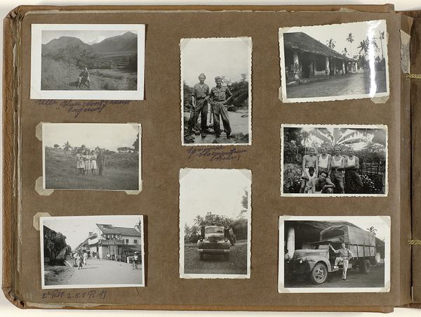 Editor: We're looking at a collection of albumen prints from 1949, titled "Dagelijkse leven in het tentenkamp," which translates to "Daily Life in the Tent Camp." They seem to be from a personal photo album. Looking at the visual syntax, the arrangement of these rectangular shapes with their varying subjects – what immediately draws your attention from a formal perspective? Curator: Indeed, the accumulation of rectangular images—akin to windows—arranged on the neutrally toned page plane creates a study of contrasts. I’m interested in the syntax that emerges, whereby different modes of being are granted similar status and size through visual alignment, leading us to decode the syntax that has emerged through juxtaposition. Note how the composition prompts questions about negative space. Is there any importance? Editor: That's interesting! I hadn't thought about the importance of that kind of framing before. It definitely seems deliberate. Could this collection also show the relation between the subjects or settings depicted in each photograph through framing each? Curator: Precisely! We see the artist utilising a technique to provide contextual meaning through compositional techniques; observe how these discrete images become segments within a network by bordering all together, an ordering which then begs questions of interpretation and how meaning can be extracted through comparison of formal syntax. In each frame the formal structures guide us—look at the balance of dark and light tones, the geometry of lines, how they shape the planes, leading our eye throughout and directing what stands apart from what recedes, so to better comprehend that ordering! How can these structures of planes in balance point to ideas that cannot be found with only cultural meaning to it. Editor: So, through its careful arrangement, this personal album becomes a deliberate composition and the varying techniques invite interpretations? I see the appeal of that perspective! Curator: We decipher this piece through semiotics and syntax, acknowledging that even in seeming documentary modes, composition can yield narrative meaning as we search in decoding this. It is also good to look from a point of visual planes. The lines that divide planes are important and its interpretation. Editor: It seems that it's something to really unpack there that can create different understandings, the relation to negative spaces that also act as border.