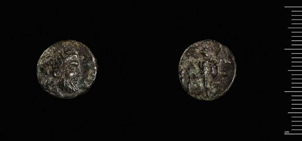 Editor: This is an Obol from Ecbatana under Alexander the Great. It's incredible to hold something so small, yet so tied to a powerful figure from history. What symbols or meanings do you see embedded in this coin? Curator: The imagery carries a tremendous weight. On one side, we see Heracles, a figure adopted by Alexander, signifying strength and divine lineage. On the other, Zeus sits, representing authority. These weren’t just images; they were potent symbols legitimizing Alexander’s rule. What emotions do these symbols evoke for you? Editor: A sense of ambition and power, certainly, but also a kind of calculated manipulation of imagery. Curator: Indeed. It reveals how leaders throughout history have used recognizable cultural symbols to shape perceptions and reinforce their positions. These symbols are a collective memory, constantly reinterpreted. Editor: I never thought about how much these images would be so purposefully planned, it’s a powerful connection to the past.