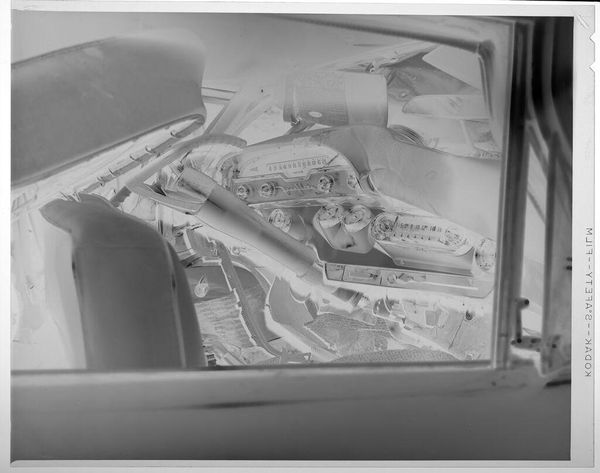 Curator: Looking at this, I immediately see a snapshot of leisure and privilege, but there is a haunting quality in this inverted tonality that I can't quite put my finger on. Editor: This photograph, "Untitled (man and woman on boat)," created by Lucian and Mary Brown, offers a glimpse into a mid-century scene of life on the water. Curator: The composition, especially in this negative format, evokes a sense of introspection. The boat itself, an icon of escape, seems almost like a vessel for the soul in this state. Editor: I agree, and consider the materiality. This wasn't a digital click; it was a tangible, chemical process. The labor involved, from preparing the chemicals to developing the image, speaks to the value placed on documentation. Curator: I see symbols everywhere. The couple, seemingly content, yet their inverted image suggests a hidden truth, a repressed emotion. It's a reflection on the human condition within the confines of a constructed reality. Editor: The image, though small at roughly 4x5 inches, feels monumental, especially considering the labor and material investment in its creation. I find myself contemplating the socio-economic context. Curator: This image reminds me of the constant interplay between outward appearances and inward realities. Editor: For me, it’s a reminder of the complex processes behind the creation of even seemingly simple snapshots.