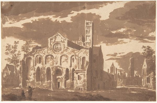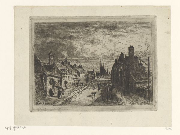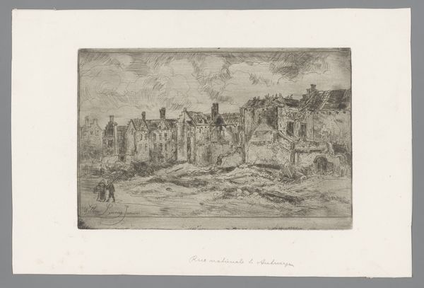 Editor: We're looking at "Forum Romanum," an etching by Etha Fles, created sometime between 1867 and 1948. It has this incredibly somber feeling to it. The sky is heavy, and the etched lines create a textured surface that seems almost gritty. What strikes you about this piece? Curator: The compositional elements are quite compelling. Note the tonal range, primarily grayscale, that creates atmospheric perspective and directs the eye. The texture arises from the etching technique, specifically, the layering and varying depth of the etched lines. Are you picking up on how the horizontal lines across the top play against the verticality suggested by the buildings below? Editor: I do now! It’s like a contrast between the enduring architecture and the transience of the sky. But, what's the effect? Curator: It establishes a visual dynamism that is intriguing. The relationship between line, tone, and texture converge to create that sombre mood. We should observe that there are strong horizontals but also there are clear implied verticals. How would the composition change, in your opinion, if one dominates over the other? Editor: I see, it could make the piece feel much more static or unbalanced without the dialogue of vertical and horizontal. Thank you! Curator: Consider how semiotics allows us to decipher layers within, where forms, materials and techniques convey meaning about enduring forms, in visual terms.