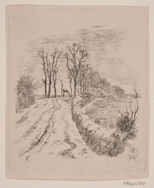 Curator: This etching, "Landweg bij Vilvoorde," by Carel Nicolaas Storm van 's-Gravesande, created before 1872, captures a stark, wintry scene. It's held at the Rijksmuseum. What are your first impressions? Editor: I find it incredibly detailed, especially for an etching. The lines create such texture. How does the choice of materials and the printmaking process influence how we should interpret it? Curator: Well, the act of etching itself – the labor-intensive process of biting into a metal plate with acid – speaks to a very specific kind of image production in the 19th century. This wasn’t about mass production in the photographic sense, but about a crafted, repeatable image. What do you notice about the subject matter? Editor: It’s a rural scene, a road… and lots of trees, maybe a construction site, with logs on the ground and smoke in the distance? It seems very much rooted in the everyday. Curator: Exactly. By focusing on this “everyday” scene—a simple road and its surroundings—van 's-Gravesande elevated the materials and labor involved in representing it. Do you see it as challenging the art world’s prevailing focus on more traditionally “noble” subjects, like historical or religious scenes? Editor: I do see that. Focusing on labor in a realistic depiction feels like it's saying something about the value of the working class. And printmaking itself made the work accessible for more people, so it also changes how art is consumed, right? Curator: Precisely. Consider the availability of prints versus unique paintings: this work democratizes art viewership, impacting its social role. It turns the art object into something circulating, discussed, and experienced in potentially radically new ways. So, in seeing a humble scene reproduced, we should consider how that challenges existing norms and how materiality itself produces meaning. Editor: I’d never thought about an etching in terms of material processes challenging artistic hierarchies! Thanks, that really changes how I see it. Curator: Absolutely. By considering production, consumption, and class, a landscape becomes much more than a pretty view.