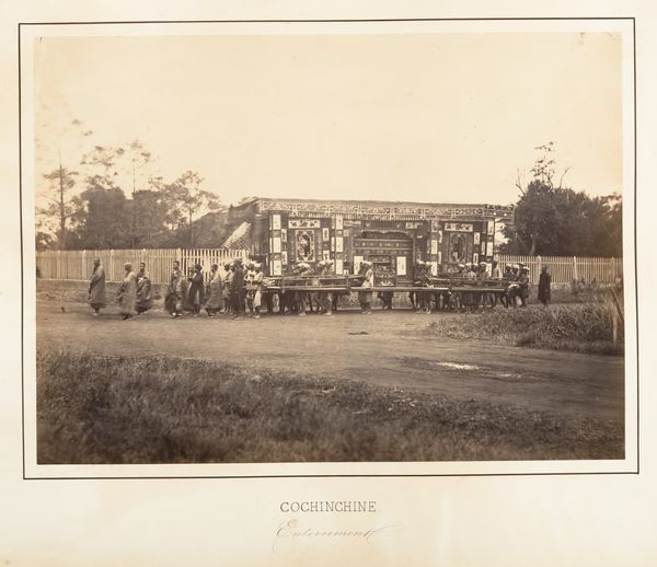 Editor: This is "The Grand Stand Foochow," a gelatin-silver print from 1869 by John Thomson, currently housed at the Metropolitan Museum of Art. It’s… crowded! A whole host of people are captured in a single frame, leaving me curious about who they are. What catches your eye? Curator: What I notice first is the tension in the stillness, it feels like a photograph holding its breath, doesn’t it? Look at the array of faces—a fascinating cultural intersection. Thomson captured this image in China. Have you noticed how carefully everyone is arranged? Editor: It does feel staged, yeah! They seem to be a mix of both Westerners and Chinese individuals. How do you think their arrangement communicates the cultural context? Curator: Good question! Think about who’s closest to the camera, who’s further back, in shadow…Consider the Western presence in China at the time – a dance of power, influence, and observation. Thomson’s work documented a society in flux. What stories do you imagine playing out behind those faces? Editor: I hadn't considered that some people are in shadow! Maybe that implies secrets, or hidden intentions… I wonder what it was like for Thomson to take this photo. He probably stuck out quite a lot! Curator: Probably! As did his massive camera. Each image must have been an exercise in cultural exchange. Can you imagine the patience required? It makes me think about the fleeting moments of connection and the lasting impact of cultural encounters. How do you feel about that? Editor: I now feel aware of what it took to construct that image, as a work of art and social document, thank you. I am grateful for being able to witness, through this piece, a moment frozen in time, and its multiple layers. Curator: Beautifully said! Every old photograph carries within itself whispers of worlds that have changed, or stayed the same. It makes me feel hopeful.