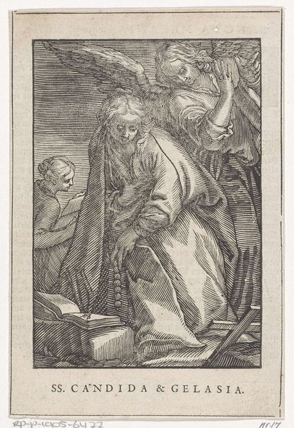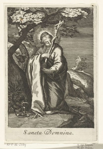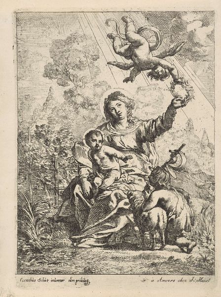 This is Jonas Umbach's "Stigmatization of Saint Francis," an etching of around 1650. Notice how Umbach uses the stark contrast of dark lines against the light paper to create a dramatic scene. Saint Francis is kneeling, his body forming a diagonal line that cuts through the composition, drawing our eyes immediately to him. The lines etched into the plate create textures that give depth to the clouds, foliage, and the saint's rough habit. The stigmata are represented by delicate lines extending from a winged figure above, almost like threads connecting the divine and the mortal. The background, with its distant buildings and serene landscape, offers a stark contrast to the intense, personal moment of Saint Francis's spiritual experience. This contrast—between the detailed foreground and the softer background—forces a visual tension that mirrors the inner turmoil and spiritual ecstasy of the saint, whose experience transcends the earthly realm. The formal elements here are not merely decorative; they are intrinsic to the narrative and the emotional impact of the artwork.
