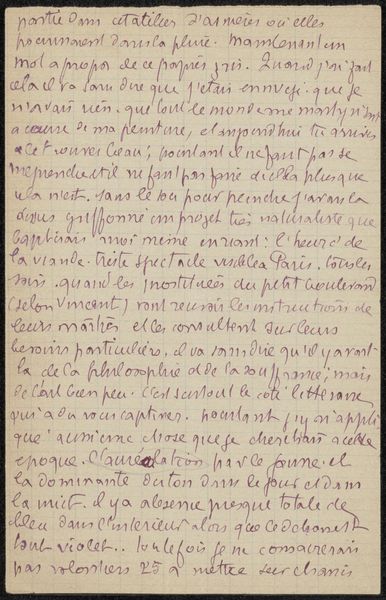 Curator: We’re looking at "Brief aan Héloïse Bernard-Bodin," a drawing in ink on paper by Émile Bernard, dating from around 1895 to 1898. The piece appears to be a handwritten letter. Editor: It feels very intimate, doesn't it? The density of the script and the close cropping lend it a sense of immediacy, as if we're peering over the writer's shoulder. Curator: Exactly. Bernard was deeply engaged in Symbolism at this time, which valued subjectivity and interiority. The choice of handwriting itself becomes significant; it’s not just the content, but the very act of inscription, the labor involved in carefully forming each letter, that conveys meaning. How would access to such correspondence been different in the past from today? Editor: Considering the era, such a personal missive would hold tremendous weight, traveling via post, freighted with anticipation. Now, the ubiquity of digital communication alters the very notion of the handwritten letter; this tangible object speaks to the history of relationships, of distance, and communication norms shaped by material conditions. The content here almost appears like an aside given the density and intimate scale of the piece. I suppose its reception then compared to now might involve considerations around privacy. Curator: Yes, the socio-cultural aspect of correspondence then contrasts sharply with our current digital habits. Bernard wasn’t just creating a message, but performing an act of connection deeply rooted in 19th-century social structures. He uses very economical means in order to render that exchange meaningful—he may have cared less for the traditional medium expectations or even his audience in that regard, and more in the ability to translate intimacy as honestly as possible. Editor: It really forces us to consider the museum as an intermediary in how that intimacy now makes itself legible to our modern viewing sensibilities and consumption. I wonder, how did period museum exhibition choices alter how the average viewer received such gestures of sentiment? Curator: That's an insightful consideration to note that highlights how meaning becomes overlaid. I came to this work examining the raw construction of communication. I leave our conversation seeing something about our relationship to that communication.
