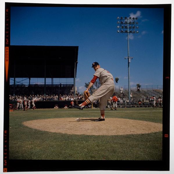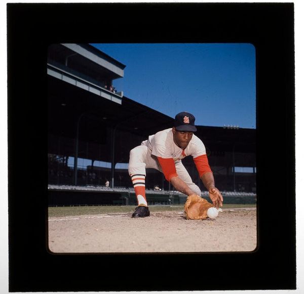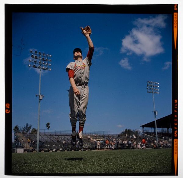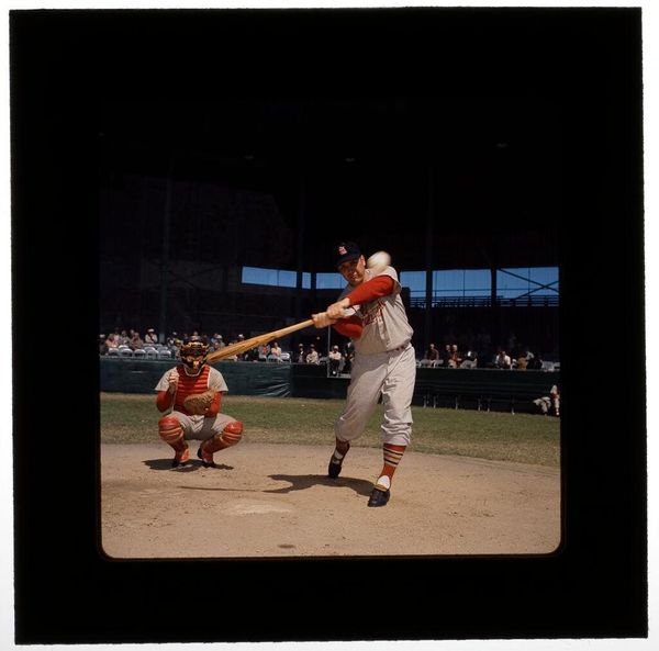 Curator: This compact photograph, attributed to Jack Gould, captures an unnamed Cardinal baseball player in mid-swing. It's a small piece, only about 2 inches square. Editor: The anticipation hangs in the air, doesn't it? The tension in the batter's stance, the blurred ball… It feels like a potent symbol of American leisure and competition. Curator: Precisely, baseball’s symbolic weight is vast. It emerged as a unifying spectacle during the late 19th century, embodying ideals of fair play and national identity. Editor: And notice the details of the uniform—the Cardinals logo, the cap. These aren't just sports garments; they're emblems of community, history, and belonging. Curator: Absolutely, and Gould, through this image, participates in shaping and reflecting these cultural values and projecting this American aesthetic through form and composition. Editor: It's a snapshot frozen in time, but one that resonates with broader social narratives. It makes me think about nostalgia and memory. Curator: It is a memory, but also a lens through which to view the cultural currents that shaped our society. Editor: I think this image is a great reminder of how art can be found in unexpected places. Curator: Indeed, and how the seemingly simple can reveal profound truths.