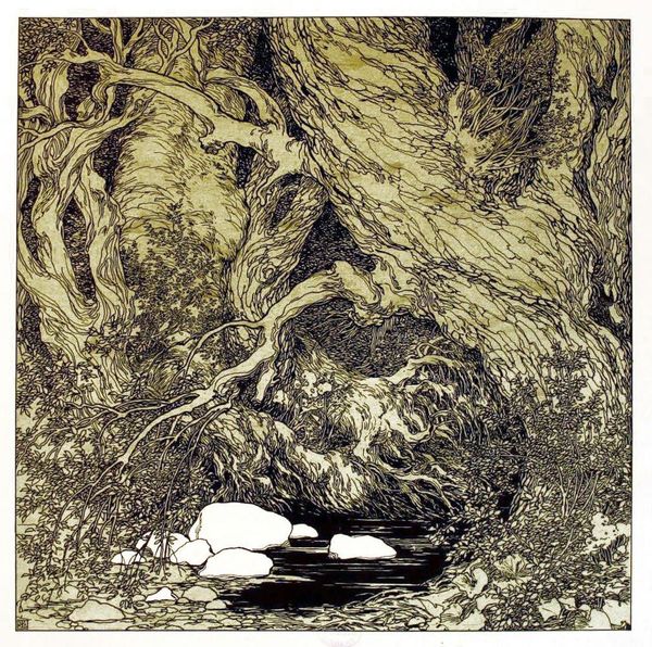 Editor: We are looking at “Ocean Cliffs,” a print by Eyvind Earle. I am really struck by the almost hypnotically patterned textures; it gives me the sense of looking at a geological map or some kind of strange crystalline structure rather than the ocean cliffs referenced by the title. What do you make of it? Curator: The stark contrast and the geometrical configurations of the landscape elements present a compelling study in form. The artist’s reduction of natural forms to near-abstract patterns creates a fascinating tension between representation and pure design. Note how the cascading lines mimic the flow of water but simultaneously operate as purely visual elements. Editor: Right, I see that. It’s representational, but then those repeated shapes also exist independently. Does the fact that this is a print influence how we should interpret it? Curator: Absolutely. The medium necessitates a certain simplification and flattening of form. Consider how Earle utilizes the inherent limitations of the printmaking process – the bold contrasts and precise lines – to achieve this distinctive visual style. It compels us to see the cliffs not just as scenery, but as constructed visual events. How would you describe the organization of forms on the page? Editor: It feels to me like everything flows downward. All of the texture in the rocks is vertical and gives me that directional push downward. Curator: Precisely. And that controlled, almost artificial directionality adds to the artwork’s dynamism. While seemingly a realistic scene, its abstract and stylized quality removes it from the purely representational. Earle uses a keen understanding of the properties inherent in printmaking and the natural inclination for pattern recognition to great effect. Editor: So, in seeing the visual interplay, we come to understand Earle’s control over visual dynamism to show the sea. That's an insightful approach; it focuses on the visual vocabulary and structural foundation!