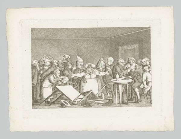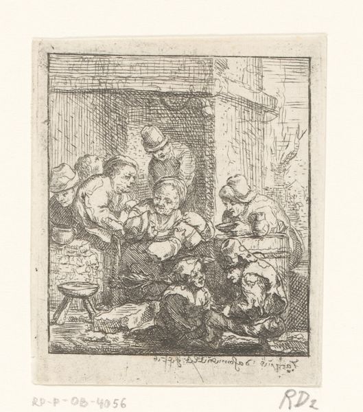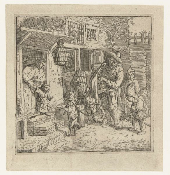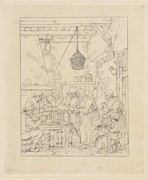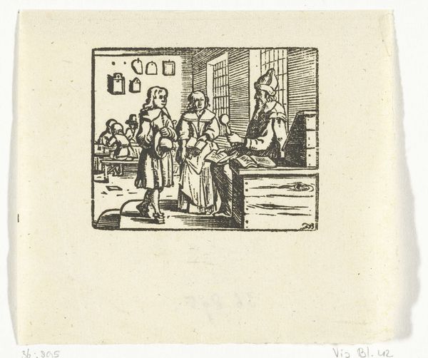 Isaac van der Vinne made this print of a classroom scene sometime in the late 17th or early 18th century, using a technique called woodcut. The process involves carving an image into a block of wood. The remaining raised surface is inked and then printed onto paper, creating the design. Here, the artist has skillfully cut away the wood to leave behind a network of fine lines, which describe the figures in the schoolroom. The way the scene is rendered using only stark black lines on a white background lends a striking simplicity to the overall image. Woodcut is one of the oldest printmaking techniques, going back centuries. It requires a patient hand and a deep understanding of the material. In this case, the process speaks to the importance of craft and skill in image-making. While not necessarily a fine art, prints like these were crucial in disseminating visual information in an age before photography. They remind us that artistic expression is not just about individual genius, but also about the social role of making.
