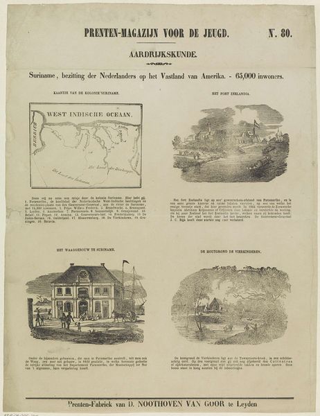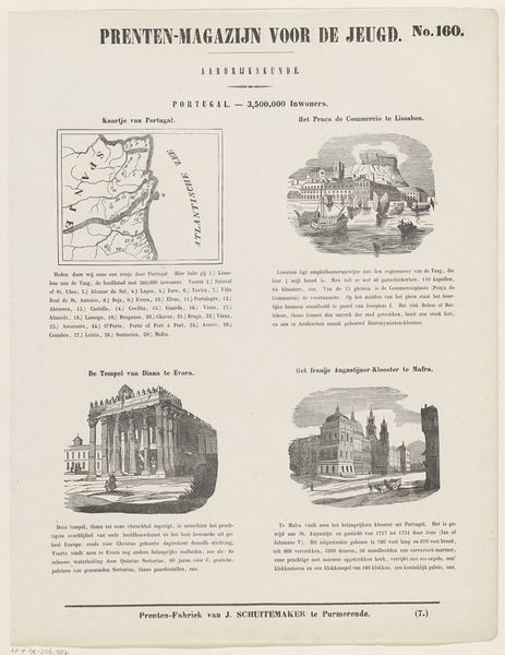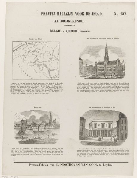 Curator: Today, we’re looking at an engraving entitled “Belgie. - 4,000,000 inwoners,” which translates to "Belgium - 4,000,000 inhabitants." Created around 1850 by Jan Schuitemaker, this graphic art print presents a view of Belgium. Editor: It’s interesting! A grid of different landscapes within one frame, with varying gray values. There's an almost clinical detachment in the precision of line work. Curator: Indeed. It's fascinating how this piece encapsulates the 19th-century desire to classify and understand the world through visual representation. We see this exemplified with the map, alongside significant cities such as Antwerp, and Brussels. These visual cues serve as symbolic shorthand. Editor: Focusing on those blocks: in that image of the Antwerp cityscape, we have almost a caricature of maritime commerce, while the architectural space pictured is much more geometrical. But how does that speak to this idea of cultural memory? Curator: Well, I'm struck by the deliberate placement of these cityscapes and maps. The artist is curating a view of national identity, framing Belgium, its key cities, its resources as a place of prosperity, stability and historical significance within Europe, which collectively constructs a potent visual narrative. The artist has assembled archetypes here: the busy port, the cultural center of Spa, to offer the viewer touchstones. Editor: Looking again at the visual choices: notice how that central structure in Brussels is visually framed to tower over its setting through the artist's composition. We return again to themes of power through the building's sharp steeple and position within the panel. Curator: That's right. The high vantage point allows viewers to gaze from the point of view of those in charge, while it invites one to meditate on the city’s development and relationship to larger social memory. Editor: Examining it further through a purely structural approach offers a unique perspective here. Thank you! Curator: And thank you! It has been very revealing indeed!