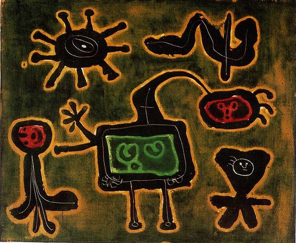 Endre Bartos made this painting, People from Space, using bright colours and playful shapes. It feels like he was really enjoying the process, just letting the figures emerge as he worked. Look at how Bartos uses the paint; it's thick and juicy, creating a textured surface that almost feels touchable. The colors are bold and vibrant – greens, oranges, and pinks that pop against the dark blue background. Notice the way the figures are outlined with dark strokes, giving them a cartoonish, almost childlike quality. The green figure on the left, with its bulbous form and triangular head, is particularly striking. The way Bartos balances the abstract shapes with the suggestion of bodies gives the painting a sense of whimsical absurdity. This kind of bold, playful use of color and form reminds me a little of Fernand Léger, who also used simple shapes and bright colors to create a sense of joy and energy. Ultimately, this painting feels like a celebration of imagination and the endless possibilities of art.
