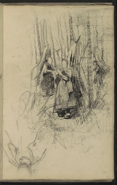 Editor: Here we have P.C. Skovgaard’s "Skovinteriør" from 1870, created with pencil and graphite. The sketch captures trees in a forest setting, a classic landscape study. It’s quite simple, but also calming. What do you see in this piece? Curator: I see more than just a calming landscape. I see Skovgaard grappling with the complexities of nature and national identity during a period of immense social and political change in Denmark. How might this interior view of the woods, seemingly serene, be understood as a coded representation of Danish cultural resilience against external pressures? Consider the density of the forest, the way the trees intertwine, creating both a barrier and a refuge. Editor: That's interesting, I didn’t think about it like that. So, the forest acts almost like a symbol? Curator: Precisely! Think about how Romantic nationalism frequently employed landscapes as allegories for the nation itself. Skovgaard, consciously or unconsciously, uses the intimate perspective, the textured details, and the play of light and shadow to create a space of both enclosure and possibility. In what ways could the seemingly innocuous forest scene reinforce or subvert existing power dynamics of the time? Editor: I see. Perhaps it’s both a celebration of Danish strength and a reminder of its vulnerability, hidden within the forest's depths. Curator: Exactly! It’s in these subtle tensions that the drawing’s power lies. Art isn't separate from life. It’s a part of it. Looking closer we can find messages about resistance. Editor: Wow, I'll never look at a landscape the same way again. I appreciate that deeper connection between art and society. Curator: And I think it’s important to continue exploring how artworks are created within, and speak back to, particular historical moments.
