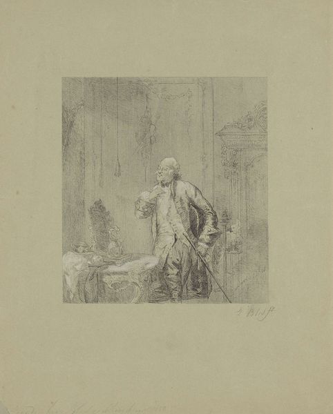 Editor: This is Charles Maurand’s, “The Auction House: The Expert,” possibly created between 1863 and 1920. It's a print, a drawing, rendered in engraving, I think? I'm really drawn to the body language of the characters. It feels like a tense moment of evaluation. How do you interpret the expressions and gestures depicted here? Curator: Indeed. Consider how the figure presenting the painting – his upturned gaze, the pointing finger – it’s a theatrical gesture, almost as if he’s channeling a divine proclamation. What might that performance signify in the context of an auction? Editor: Maybe he's trying to inflate the painting’s value? It feels a little…staged. Curator: Precisely! And observe the men in the audience. What do their hats, their averted gazes, whisper about their roles and expectations in this social drama? Think of hats as badges, markers of class, and conformity. How might they be reading the presenter's performance, and the symbolic worth he’s trying to attach to the artwork? Editor: It’s like they're all performing different roles within this ritual. Some are participating; others are skeptical. Even the small picture in the presented picture holds its own symbol. Curator: Ah, you noticed. The painting *within* the drawing - a miniature echo reflecting larger power dynamics. The curator acts as the conduit between the artwork and potential buyers, and these figures remind me of iconic symbols representing human ambition, judgement, and the often-blurry line between genuine value and perceived worth. What did you make of it overall? Editor: I thought it was just about an auction. I see now that it's like a miniature theatre where everyone plays a role. It’s all so wonderfully fraught with tension. Curator: Indeed. Art invites us to observe, dissect, and question the symbols of our world, reflecting and informing our shared human story.