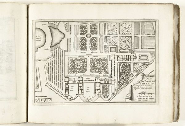 Curator: Before us, we have an engraving from 1726 titled “Plattegrond van het Huis ter Nieuburch met tuinen bij Rijswijk," an aerial plan depicting the House ter Nieuburch and its gardens near Rijswijk. It's currently held at the Rijksmuseum. Editor: Immediately, the rigorous geometry strikes me. The stark contrasts of light and shadow emphasize the structured, almost regimented, layout of the gardens. There is a clear formal order. Curator: Precisely! The piece reflects the Baroque fascination with order and control. The House ter Nieuburch, now lost, was significant politically, most famously for hosting the Treaty of Rijswijk in 1697, marking a turning point in European power dynamics. This print serves not only as a record of a physical space, but also as a symbol of political order and the assertion of power through landscape. Editor: Note how the strict lines and right angles dictate the arrangement of space. Every tree, every hedge, seems placed with deliberate precision. It’s almost mathematical in its exactitude, less about nature and more about imposed structure. What is nature except an uninhibited material to which we, as creators of spaces, choose how to give new form? Curator: And it served a crucial function. Landscaping during the Baroque period wasn't merely decorative. Gardens were extensions of the palace, projecting an image of power and mastery. This print allows us to study the visual language through which such statements were communicated. The treaty being held at this location emphasizes this architectural plan's importance to world politics at the time. Editor: Looking closely at the technique, the linear quality of the engraving enhances this sense of precision. The lack of tonal variation—the stark blacks and whites—furthers the graphic nature. The gardens themselves almost resemble an intricate architectural diagram as a result. Curator: I agree. In its crispness, it mirrors the very essence of the period's emphasis on clarity and control. It reminds us how art acts as both a product of, and a participant in, its cultural and political milieu. Editor: A captivating fusion of precision and form then, truly representing not only the reality but the ideals of its historical moment. Curator: Indeed, a telling glimpse into the architecture of power of the time, rendered meticulously in ink and paper.