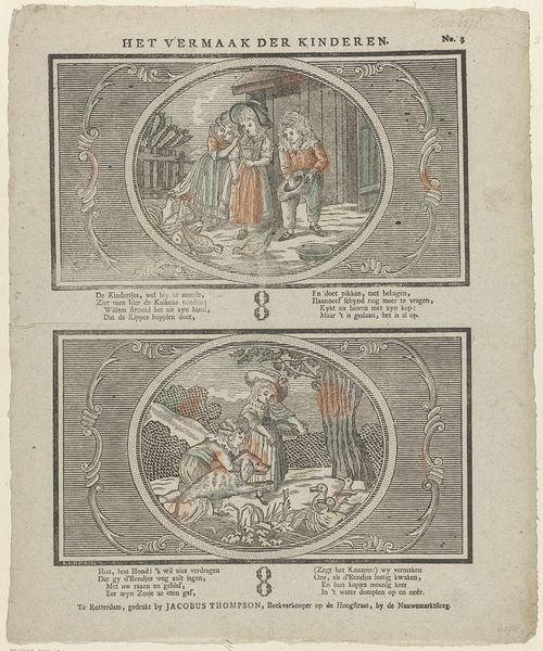 Christiaan Jacob Schuyling created this print in the Netherlands, sometime around the early 19th century, using etching. The image is divided into four scenes, representing the seasons of life. Each scene reflects the social values of the time, particularly around family and civic duty. The first shows children enjoying spring, followed by young adults in summer giving thanks. The third depicts a wedding in autumn, and the final scene shows a family in winter, with the father reading by the fireside. This final scene reflects the importance of familial knowledge and the passing on of tradition. Prints like these offer us a window into the social and cultural life of the Netherlands at the time, and the values that were considered important. By looking at the clothing, the activities depicted, and the surrounding landscapes, we can begin to understand the priorities of Dutch society and the role of the family. Resources in local archives might give greater context to the social values of the time.