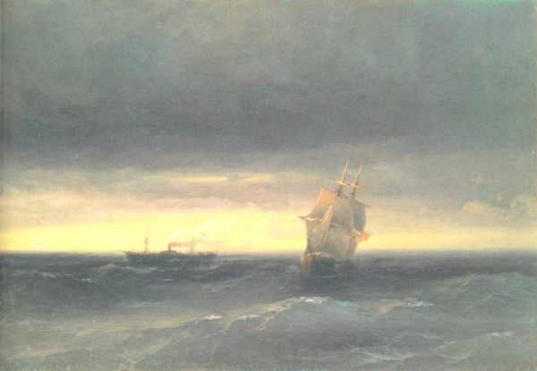 Ivan Konstantinovich Aivazovsky created this oil on canvas painting, Rough Sea at Night, now held in a private collection. The overall visual experience is dominated by the dramatic interplay of light and shadow, with turbulent shapes and muted colors creating a sense of foreboding. The materiality of the paint, thickly applied, enhances the texture of the raging sea and stormy sky, evoking an emotional response of awe mixed with fear. Aivazovsky masterfully employs a semiotic system of signs where the stormy sea represents the sublime power of nature, and the precarious ship becomes a symbol of human vulnerability. The composition, structured around diagonal lines of crashing waves and the tilting mast, destabilizes the conventional maritime scene. This challenges fixed notions of safety and control, reflecting broader philosophical concerns about humanity's place in the natural order. The formal quality of dramatic illumination not only guides our eye but also functions as a cultural discourse on Romanticism, where nature is depicted not as pastoral but as a dynamic, potentially destructive force.