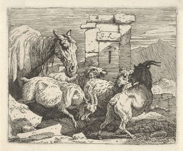 This etching, titled "Goats in a Farmyard", was created by Frederick Bloemaert in the 17th century. The print offers us a glimpse into rural life, rendered entirely in monochrome. Bloemaert’s use of line and composition guide our eyes through the scene. Notice how the artist uses dense, cross-hatched lines to describe the varied textures of the goats’ shaggy coats. The architectural backdrop, depicted with an almost mathematical precision, contrasts with the organic forms of the animals. The careful arrangement of the goats creates a sense of depth, leading us from the foreground towards the buildings in the distance. In its structure, the print seems to be both a realistic depiction and an artful construction. This interplay between naturalism and formal design reflects the period's interest in cataloging the world, but also in refining it through artistic interpretation. Bloemaert invites us to consider the formal and the representational aspects of art, to find meaning not just in what is depicted, but how.