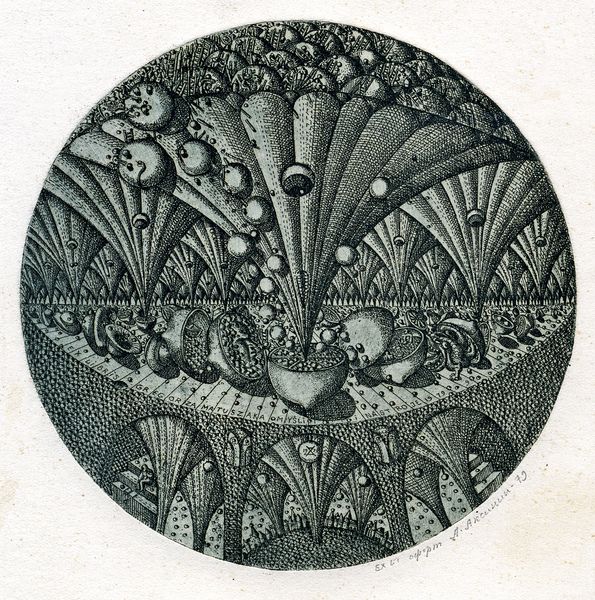 Curator: This intricately detailed piece, titled "June," was created in 1980 by Oleksandr Aksinin, employing ink in a drawing style. What are your first thoughts looking at this complex work? Editor: Overwhelming! There’s such dense patterning at play; it almost feels like a visual assault on the senses, like a beautiful, controlled chaos. Curator: Absolutely. The repetition of figures within geometric shapes suggests cycles, perhaps monthly, linking to the title. Notice the human forms interspersed with tentacled figures – do they conjure up anything familiar? Editor: The stark contrast of the figures immediately makes me consider duality: organic versus geometric, human versus… something else? The artist plays with positive and negative space, and the layered effect adds to the sensory overload. Curator: The juxtaposition feels intentional, yes. Aksinin was known for works probing the subconscious, often referencing folklore. The hybrid figures can evoke the fears and anxieties surrounding the monstrous feminine, where women can embody power, horror, or both. The circle containing each suggests social constraint. Editor: Semiotically fascinating! The use of line, creating these individual vignettes feels like an echo of older engraving styles—perhaps mimicking early scientific illustrations or astrological charts? It evokes the sensation of peering into lenses of looking through several different perspectives. Curator: A good point! Aksinin was a dissident artist during Soviet times. The patterned repetition can also suggest themes of surveillance and the individual’s struggle against imposed systems. Editor: So that visual density isn’t just an aesthetic choice. I see the repeated image now in terms of the broader sociopolitical conditions. The visual bombardment mimics the pressures felt in everyday life. Curator: Precisely, and I find this interpretation incredibly insightful. Aksinin provides layers, both aesthetically and conceptually. Editor: For me, looking more closely at "June," I'm drawn to appreciate how the contrasting visual structures create emotional discord. The drawing seems to create a mirror to our collective memories around repression. Curator: A profound assessment! Thank you.
