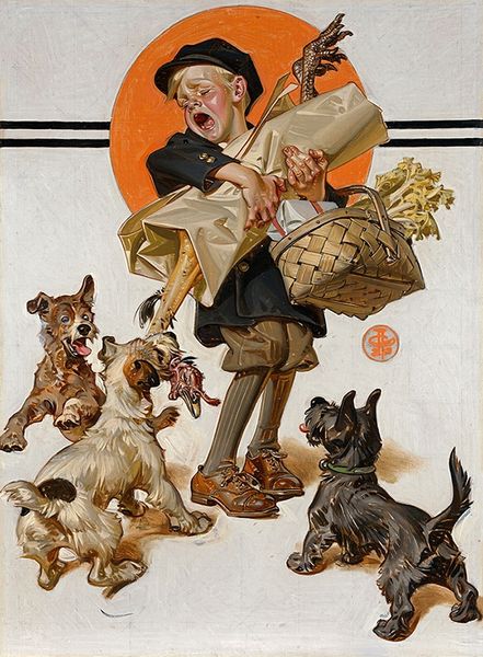 Norman Rockwell created this painting of a boy playing a flute surrounded by animals. The composition centers on a young boy encircled by a menagerie, all set against a pale blue backdrop inscribed with "Springtime," evoking a sense of pastoral harmony. Rockwell uses a semiotic system of signs, such as the flute symbolizing a call to nature. However, the animals appearing less charmed, more wary, reveal a disruption within this ideal. The artist plays with the tension between the idyllic and the real, suggesting a more complex relationship between humanity and nature. The concentric arrangement of figure, animals, and text destabilizes the traditional hierarchy, creating an uneasy balance. The muted palette and soft brushstrokes contribute to a nostalgic feeling, yet the off-kilter dynamics hint at a deeper unease. It challenges viewers to reconsider sentimental notions of harmony, pointing to the nuanced and often contradictory nature of such representations.