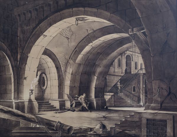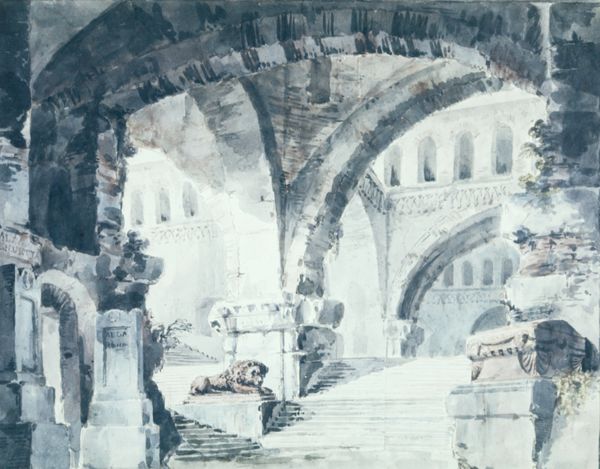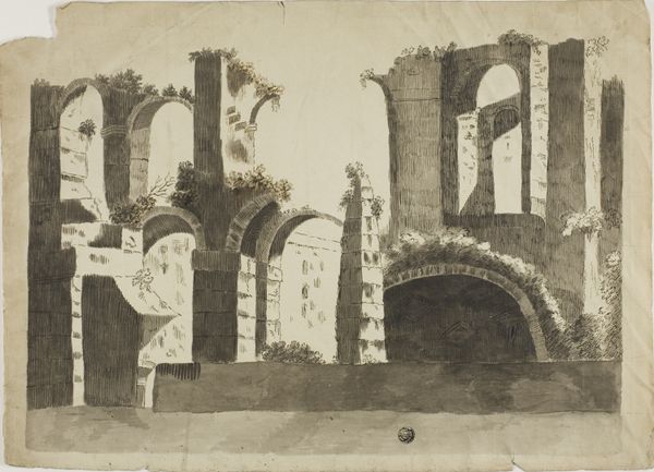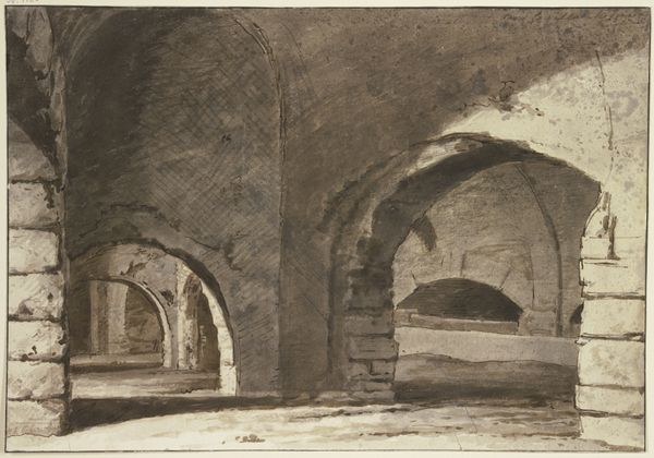 Curator: This is Giovanni Battista Piranesi's "Interior of a Large Antique Building with Barrel Vaults and a Dome Substructure," likely created sometime between 1730 and 1850. Look closely at the toned paper. What's your initial reaction to the piece? Editor: It evokes such a cavernous and sombre atmosphere. The sketchiness of the rendering makes the architecture feel almost ghostly. You feel as though you could get lost in it. Curator: I agree. Piranesi's handling of line and shading creates a play of light and shadow that defines the architectural forms. Note how the arches and vaults are built from short marks; notice the semiotics of the light, the dark lines. It lends the sketch both monumentality and an ephemeral quality. Editor: It also highlights a social context, don't you think? These kinds of monumental spaces speak of power, of course, but here they’re presented in ruin. The image prompts one to think about colonialism and Italy’s place in it: Who had access to these spaces? What labor produced them? The crumbling nature of the space really resonates with an exploration of themes of class and exploitation. Curator: The incompleteness, that almost unfinished look, might not only reflect Piranesi's process. You could be right about historical power relationships but that incompleteness might be something innate to the artwork and the structural elements and material used. There is also a focus on creating spatial depth with those layers. Editor: True, the artist employs varying degrees of finish to suggest depth and distance. But I would add this approach hints at the temporality of empires and grand structures which inevitably fade, returning power to those previously dominated. A decolonial stance, if you will, represented visually through incomplete and ghostly architectural detail. Curator: Well, whether a decolonial message or not, the drawing is more than a record. It's a mood piece, achieved through technical prowess. Editor: Perhaps the true accomplishment lies in how the material qualities themselves support, both structurally and symbolically, wider dialogues on cultural loss and, hopefully, recuperation. Curator: I hadn't thought of that but now the building as a signifier seems richer to me. Editor: Glad to be of service. It shows how much context matters.